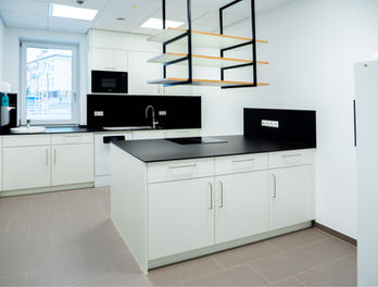 Umsetzung mehrerer verschiedener Küchen, darunter eine Küche mit einer beweglicher Küchentheke als flexible Ausgabelösung für Patienten.