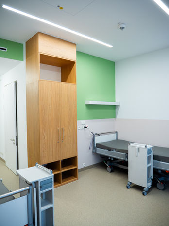 Maßgefertigte Schränke und Regale in den Patientenzimmern bieten viel Stauraum.